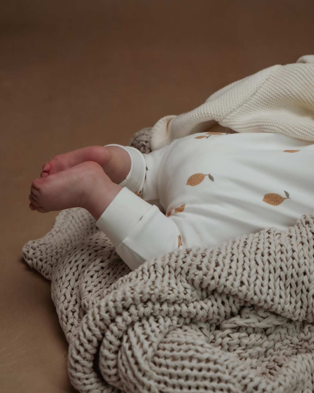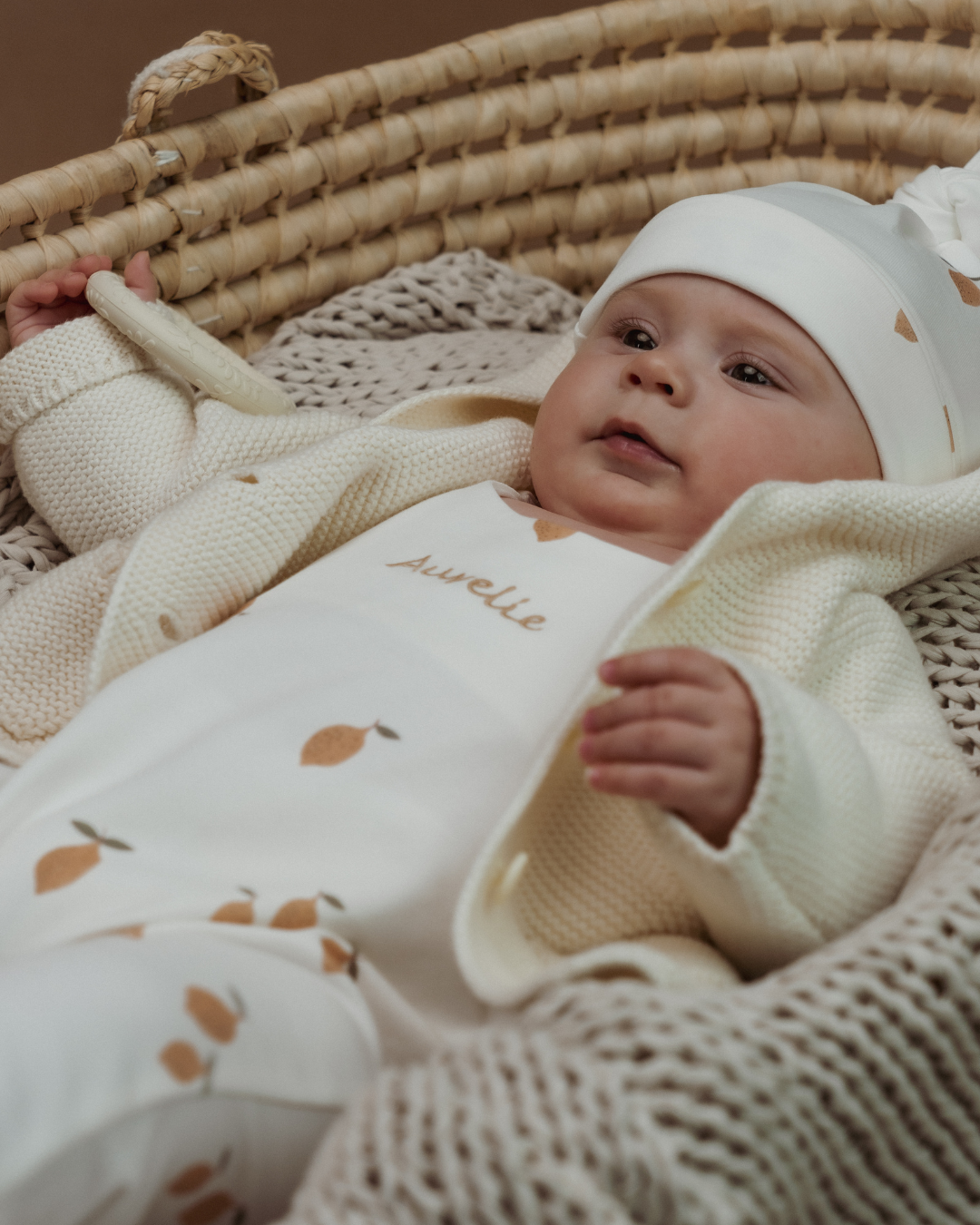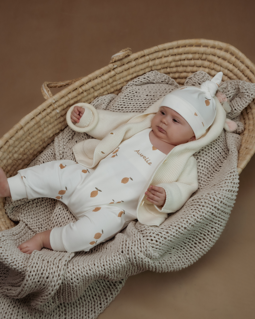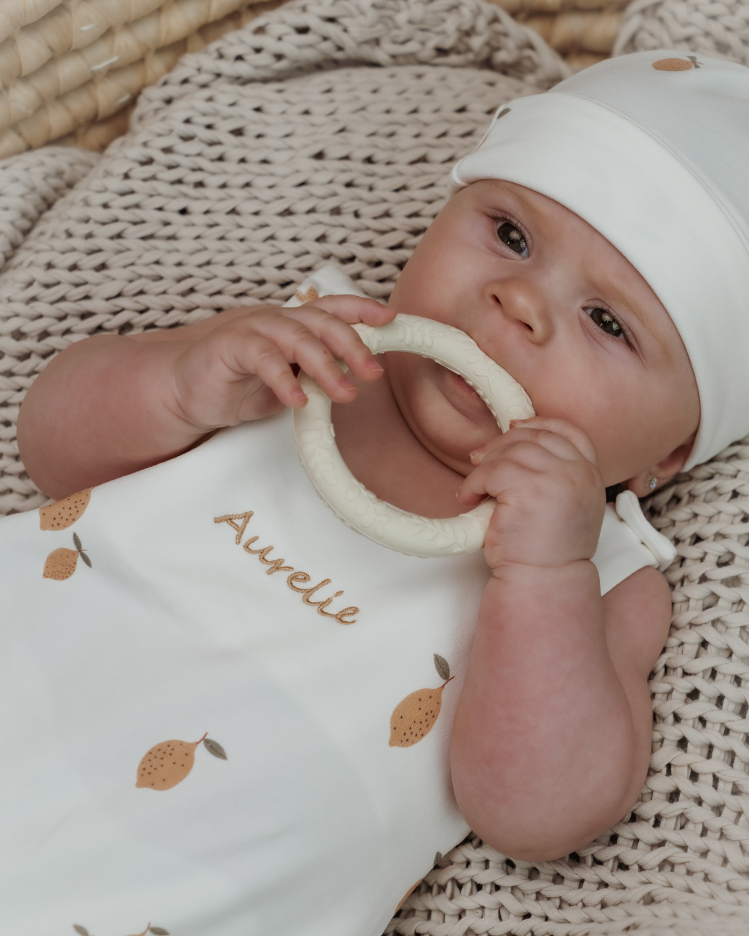 Miminko na fotce má dupačky vyšité béžovou nití a fontem číslo 1.