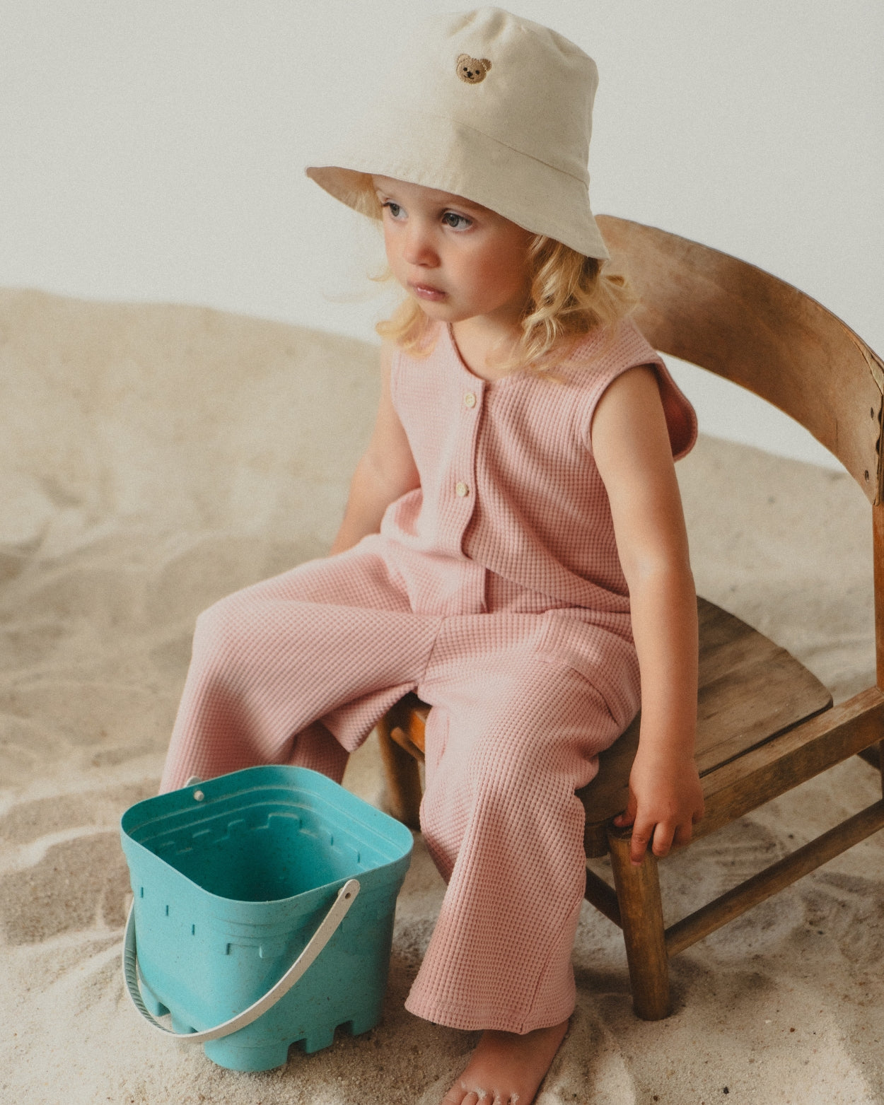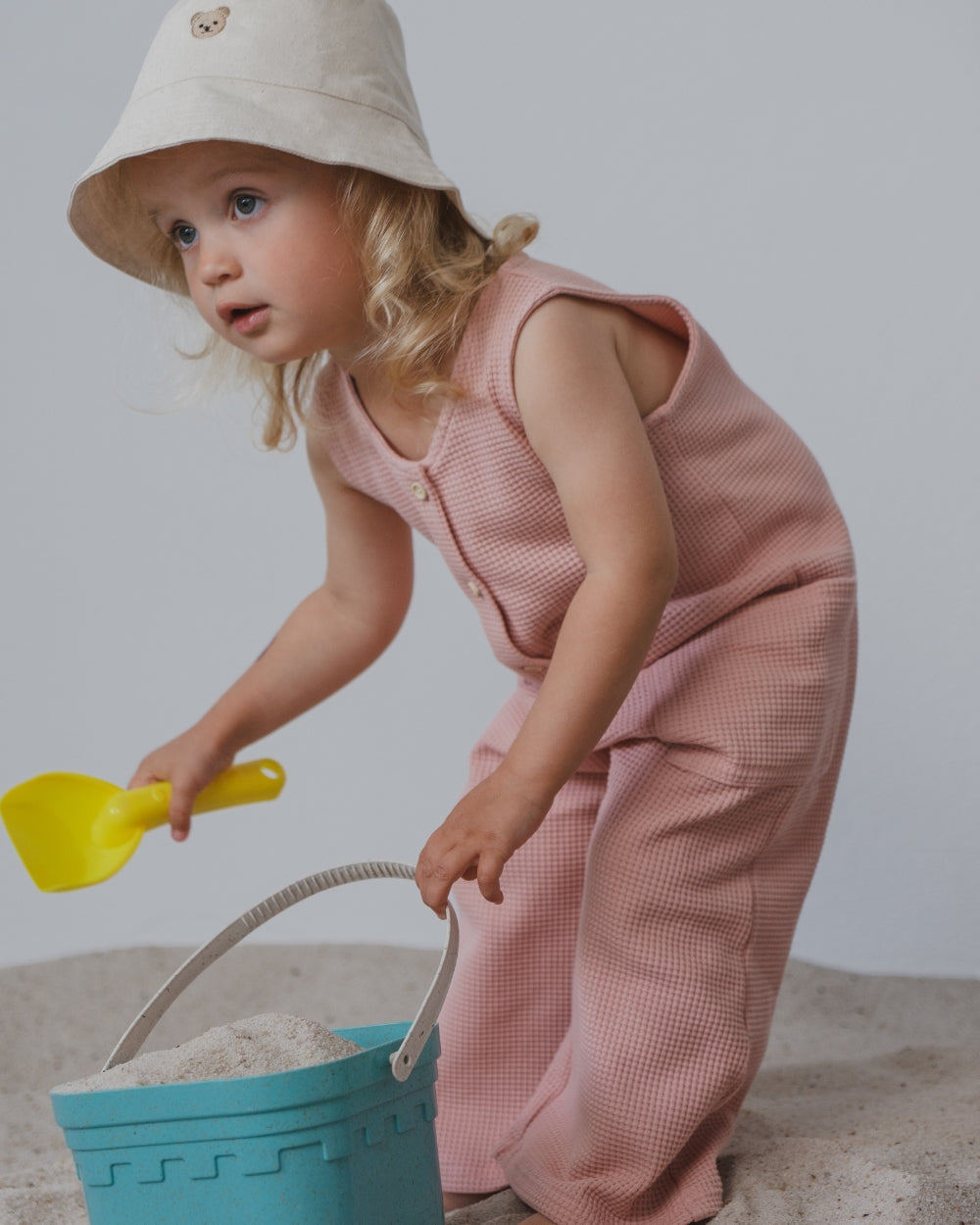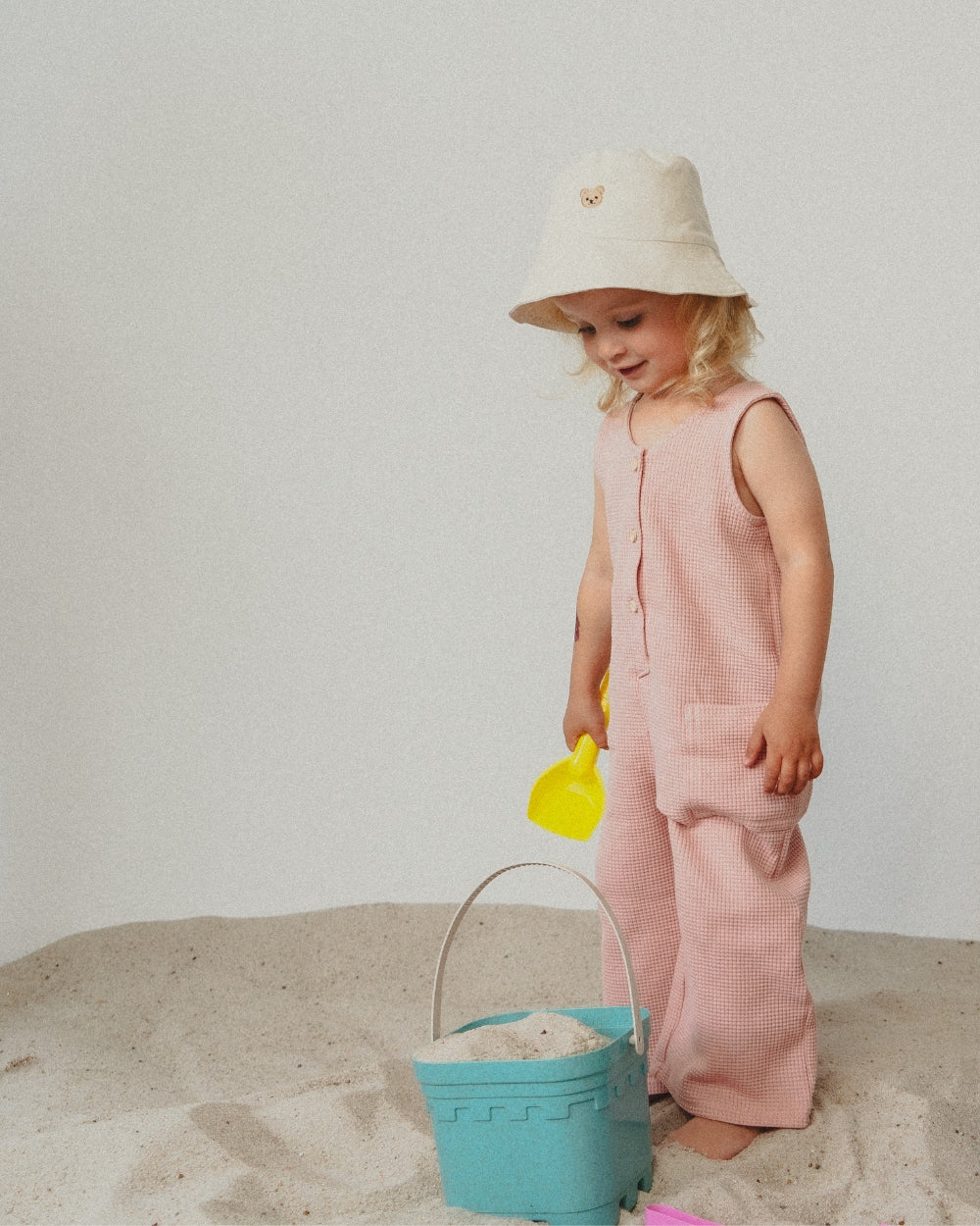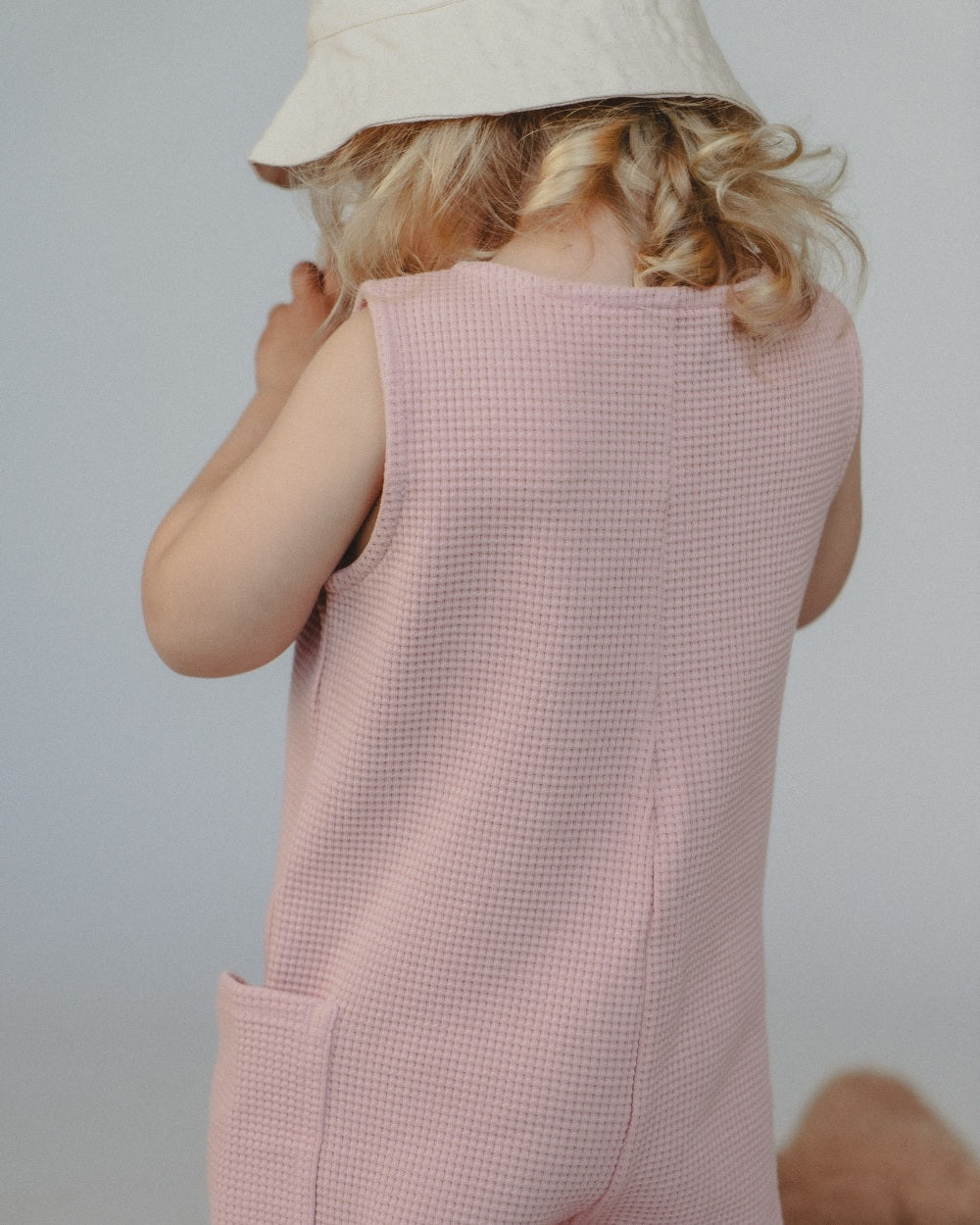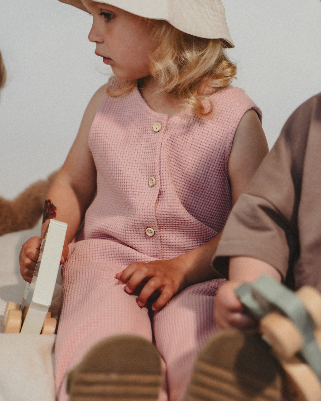 Children's romper with buttons, made of organic waffle, which is an ideal choice for summer days. Designed with your little one's comfort and style in mind, this jumpsuit features four wooden buttons for a natural and elegant look.