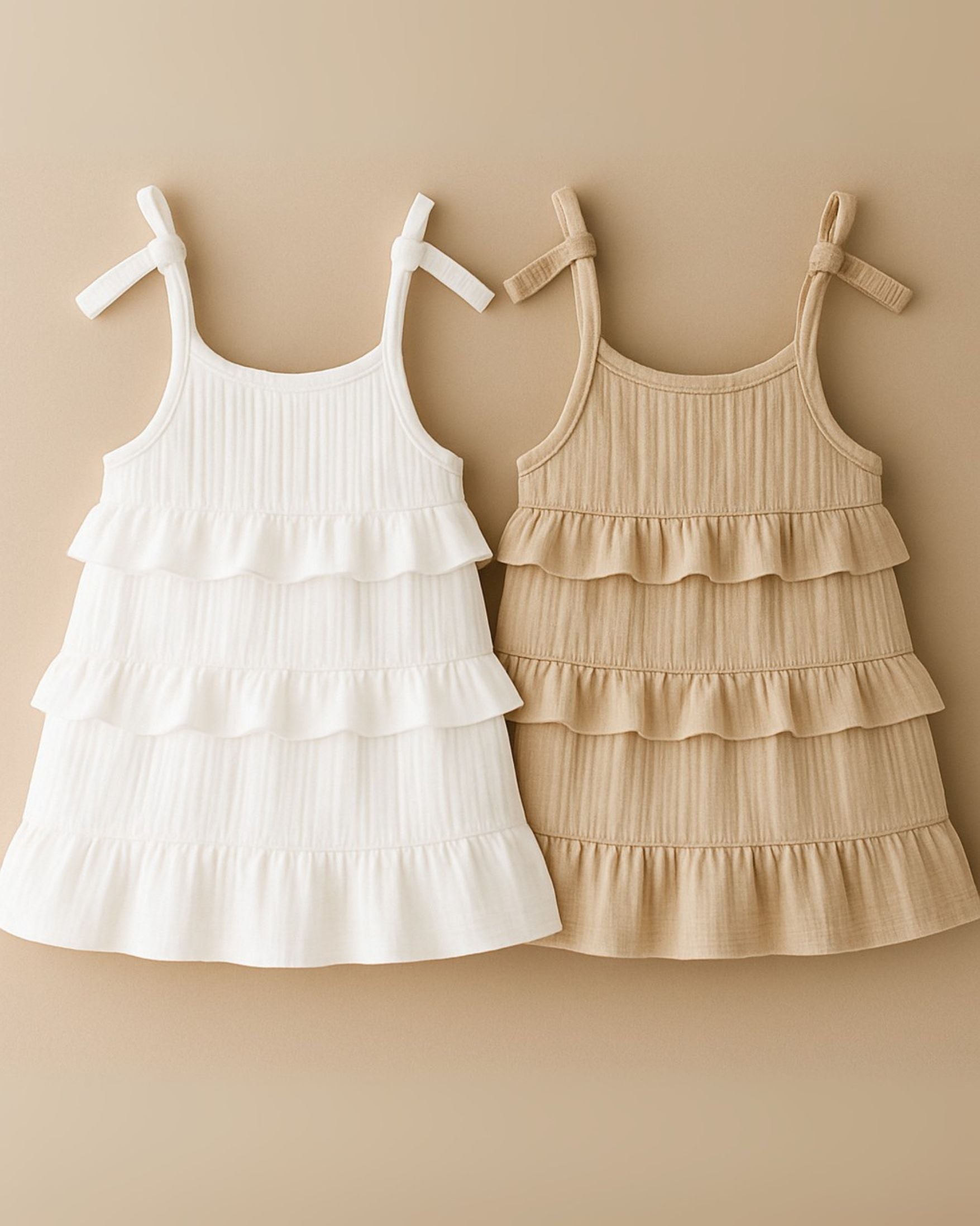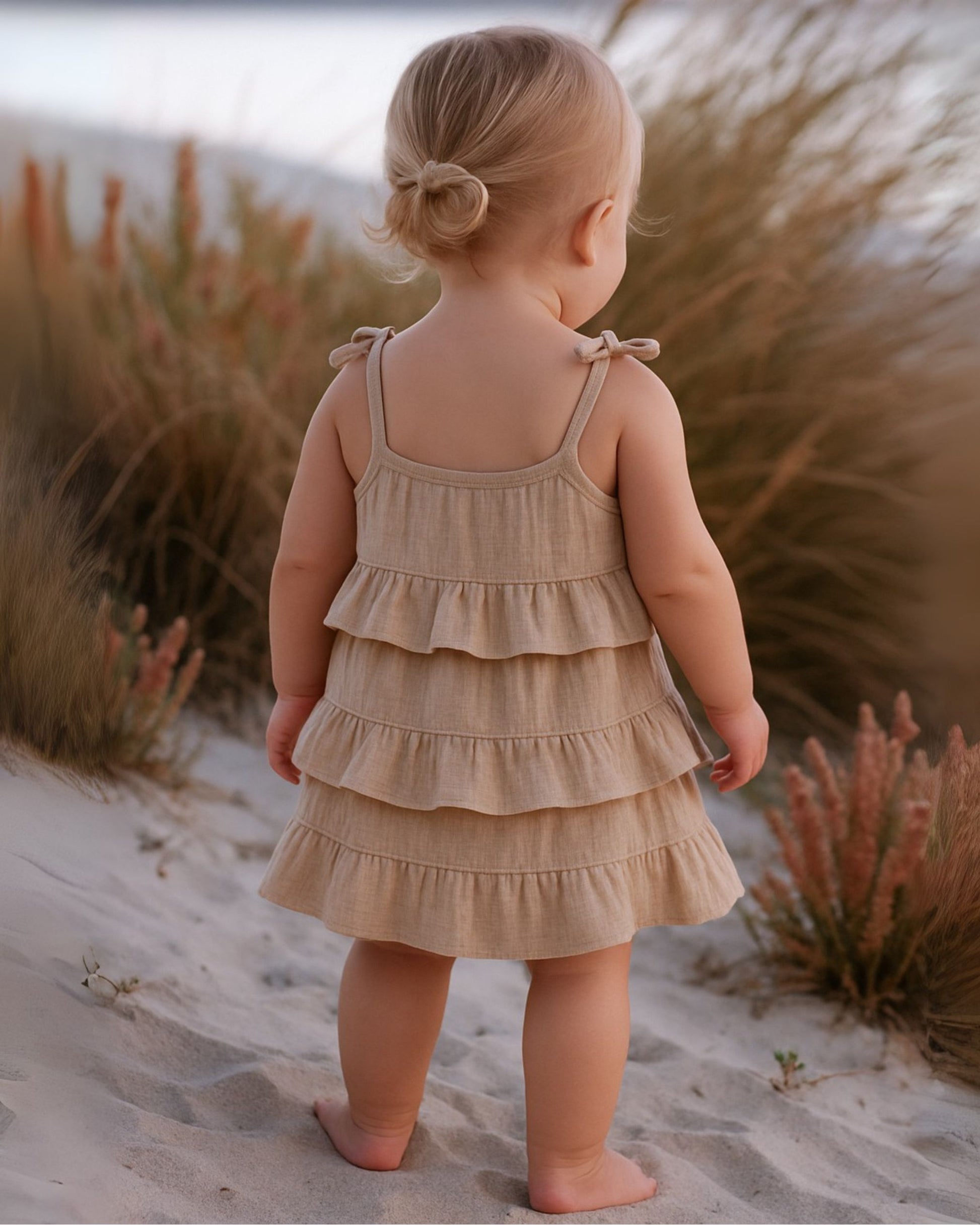 Our soft organic muslin summer dress is the perfect choice for warm days. Thanks to its layered cut with ruffles, it looks airy, playful and elegant at the same time. It is made of soft, breathable muslin that is gentle on sensitive baby skin - chemical-free, GOTS certified.